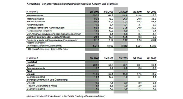 In den Segmenten Postakut und Akut ebenso wie in dem, dem Segment Sonstige Aktivitäten zugerechneten Geschäftsfeld Pflege, konnte die Auslastung gesteigert werden. Das Segmentergebnis Postakut lag aufgrund der gestiegenen Kosten mit 3,7 Mio. Euro unter dem Wert des Vorjahres (9M 2008: 4,9 Mio. Euro), hat sich aber gegenüber den Vorquartalen 2009 deutlich verbessert. Auch im Segment Akut setzt sich die bereits in den ersten zwei Quartalen 2009 festgestellte positive Entwicklung weiter fort. Das Segmentergebnis betrug 14,4 Mio. Euro, im 9-Monatszeitraum 2008 lag es bei 12,2 Mio. Euro.